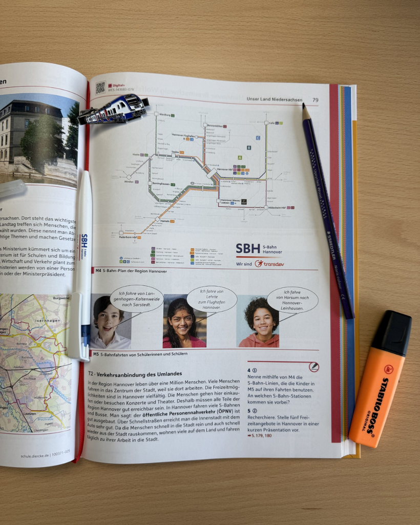 Die S-Bahn Hannover ist Teil des neuen Erdkundebuchs Durchblick für die 5. und 6. Klasse. Mit Aufgaben rund um das S-Bahnnetz entdecken Schülerinnen und Schüler die Region Hannover. Weiterlesen